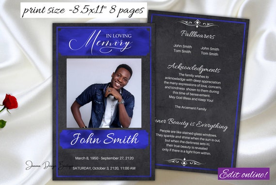 Blue Black Funeral Obituary Program Template 8 5x11 8 Etsy